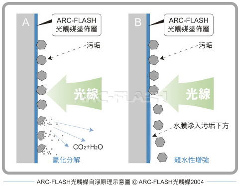 ARC-FLASH光觸媒的氧化分解能力能將細微污垢分解為二氧化碳及水(如上圖),此外超親水特性會讓空氣中的水分子形成水膜,滲入污垢下方,污垢便因無法附著而掉落,因此能夠保持物體表面的乾淨。